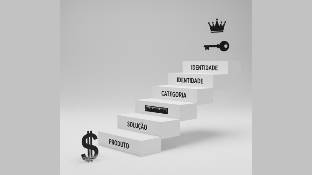 O mapa para escalar o poder de precificação da sua marca. Mostra como deixar de vender um Produto (comparado por preço) para vender uma Solução, depois uma Categoria e, no topo, uma Identidade (onde a comparação de preço se torna irrelevante).